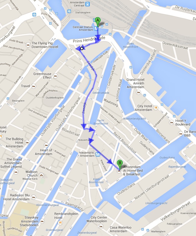 Coming out of the Central Station (Centre side) you will see a big Church across the street/station. Next to the Church on the right side you will see The Barbizon Hotel. The street next to it on the right side of the hotel is the street Zeedijk. Turn left into Zeedijk and walk through until you reach Nieuwmarkt Square. You will see a prominent castle in the middle of the square. Cross the square and keep walking on the left side. Take the street Keizersstraat next to Café Fonteyn in front of the square. Walk until you cross the bridge reaching Korte Keizersstraat. Amsterdam At Home is at number 12 on the right.